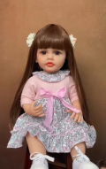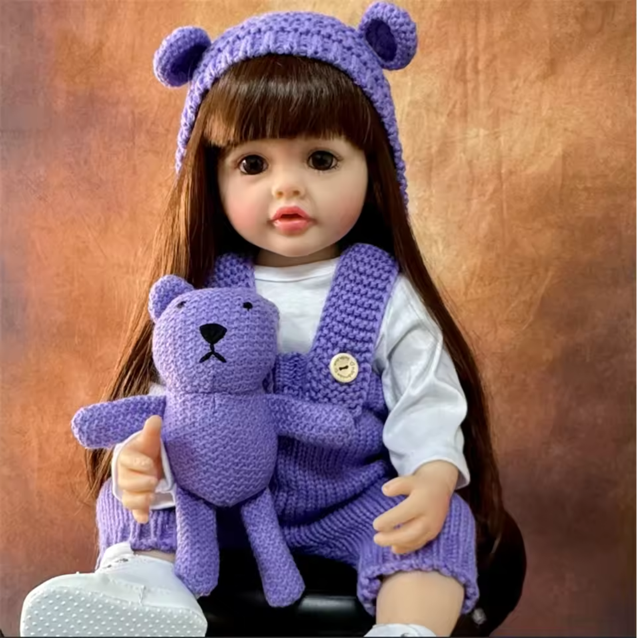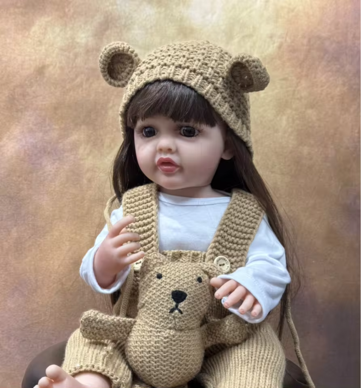 Com um tamanho encantador de 55cm, ela é praticamente um abraço em forma de boneca. O material dela é todo de silicone, um toque macio que vai te fazer acreditar que você está segurando um bebê de verdade. E que tal os olhinhos acrílicos de alta qualidade? Eles são tão brilhantes que parecem esconder segredinhos.